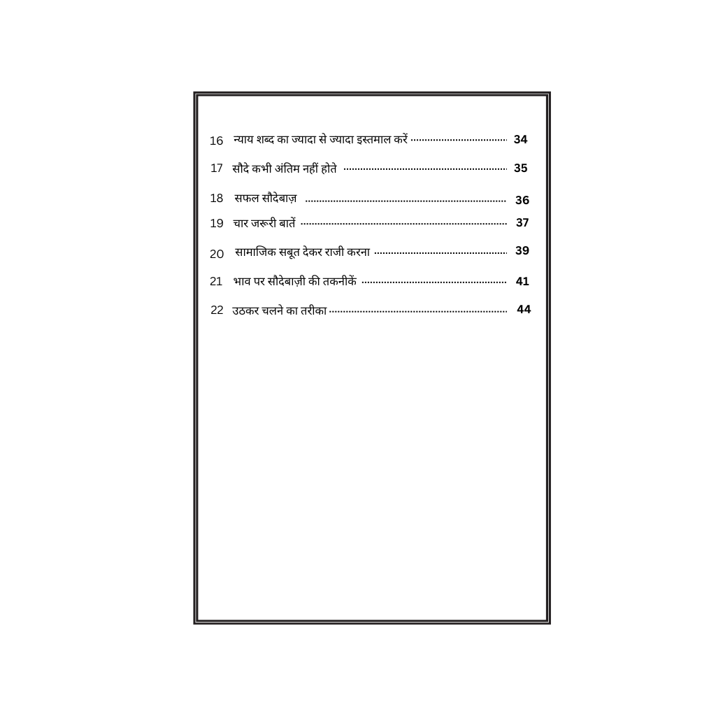 हम हर जगह सौदेबाजी करते हैं। सौदेबाजी करना हमारे जीवन का एक अहम हिस्सा है, पर अगर हमें इसमें महारत हासिल नहीं है तो हम अपनी पूरी जिंदगी में नुकसान उठाते रह जाएंगे। सौदेबाजी की कला सीखना हमारे लिए बहुत जरूरी है, क्योंकि हम छोटी छोटी चीजों से लेकर बड़ी-बड़ी चीजों यानी जमीन, जायदाद, घर, गाड़ी इन सब में सौदेबाजी करते हैं। अगर हमें सौदेबाजी की तकनीकों का पता चल जाता है, तब हम अपने लिए एक बेहतर सौदा कर सकते हैं और अपनी मनचाही चीजों को कम कीमत देकर पा सकते हैं। इस किताब में आपको सौदेबाजी से संबंधित सारी तकनीकी सिखाई जाएंगी, जिनका प्रयोग करके आप अपने लिए बेहतर सौदा कर सकते हैं और अपने आप को एक बेहतर सौदेबाज बन सकते हैं।